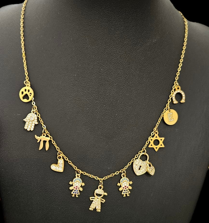 Gold Chai with Chamsa, Ribbon, Magen David and Heart
